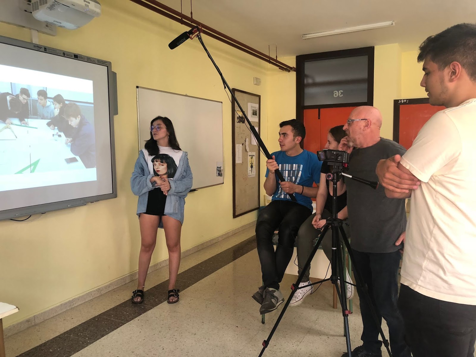 | Alumnos de primeiro explicando o proceso de elaboración do arco |